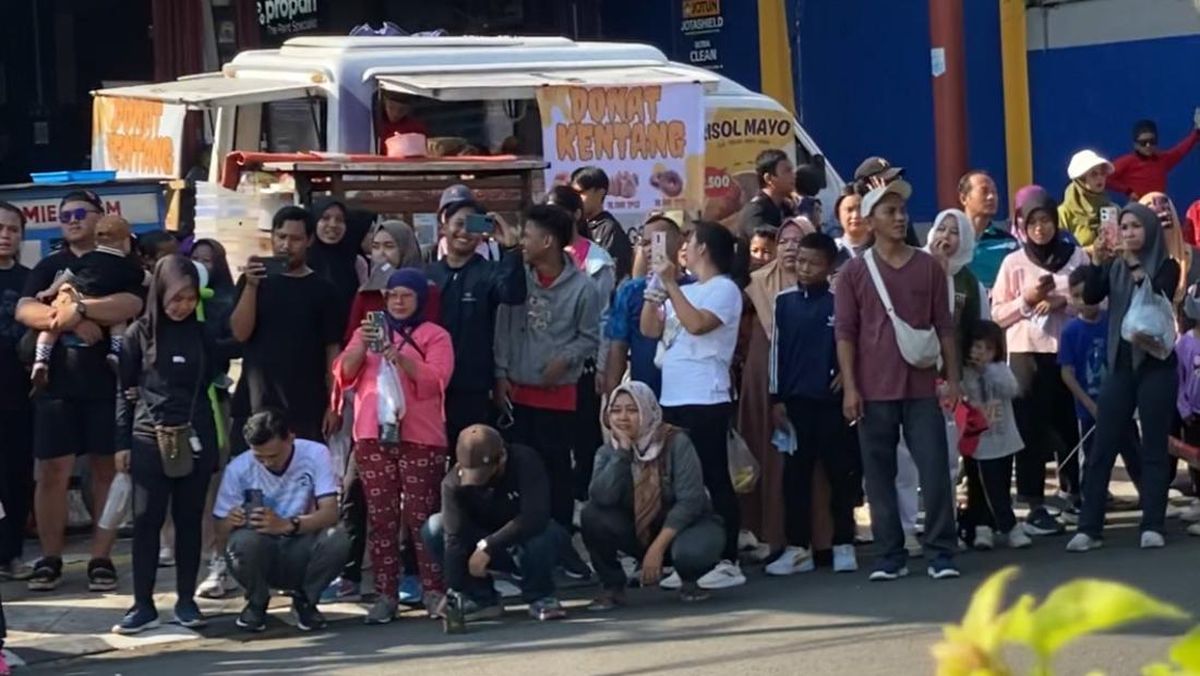 Di sepanjang trotoar, pedagang jajanan seperti cimol, batagor, dan es kelapa muda laris manis. Beberapa warga bahkan duduk di separator jalan sambil menikmati makanan.